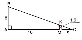 Человек ростом 1,6 м стоит на расстоянии 16 м от столба, на котором висит фонарь на высоте 8 м. найдите длину тени человека в метрах.-