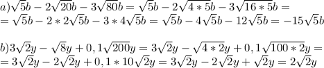 а)√5b-2√20b-3√80b= √5b-2√4*5b-3√16*5b= √5b-4√5b-12√5b=-15√5b