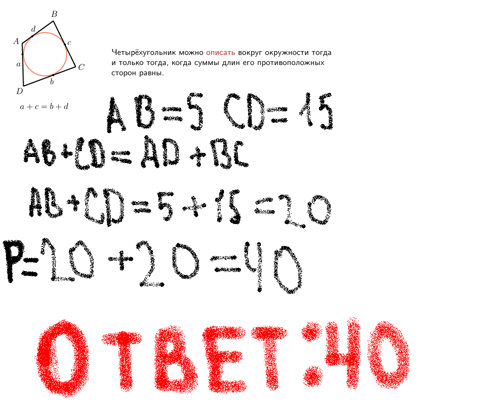 в 4 угольнике АВСД вписанный окружности АВ=5CD=15 найди перимитор
