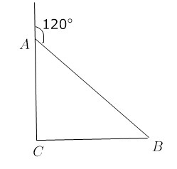 Поскольку внешний угол при вершине А равен 120°, то внутренний угол А равен 180°-120° = 60°. Тогда ∠B = 90° - 60° = 30°.