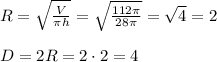 объем прямого кругового цилиндра равен 112п, а его высота равна 28. найдите длину диагонали осевого сечения