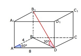 1)Основанием прямой призмы ABCDA1B1C1D1 является параллелограмм ABCD со сторонами 4 и 8 см, угол BAD=60 градусов. Диагональ B1D призмы образует с плоскостью основания угол 30 градусов.Найдите площадь боковой поверхности призмы.