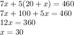 7X + 5*(X + 20) = 460