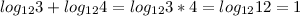 log 12 (3) + log 12 (4) = log 12 (3*4) = log 12 (12) = 1