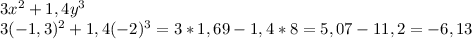 = 3*(-1,3)^2 + 1,4(-2)^3 = 3*1,69 + 1,4*(-8) = 5,07 - 11,2 = - 6,13 -
