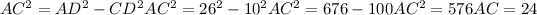 .Треугольник ACD прямоугольный, в нём AD=26 см, CD=10 см, по теореме Пифагора найдём АС.