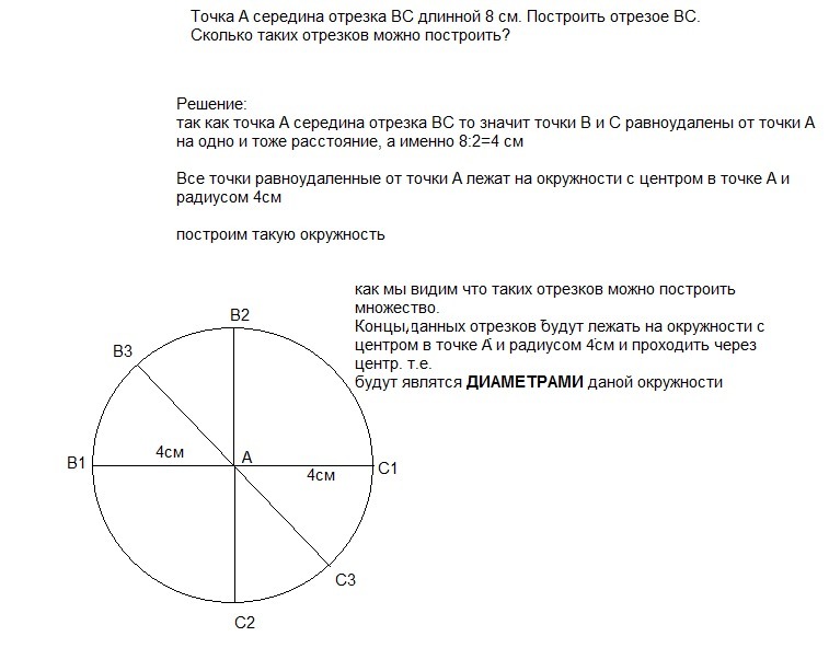 Точка А середина отрезка ВС длинной 8 см. Построить отрезок ВС. Сколько таких отрезков можно построить