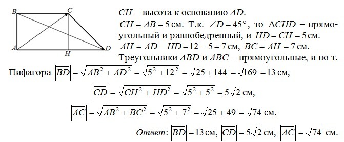 В трапеции ABCD : угол А = 90 градусов , угол D=45 градусов, AD =12см , АВ=5см. Найдите длину векторов BD , CD b AC