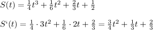 Производная функции S(t) 1/4t^3+1/6t^2+2/3t+1/2 равна-