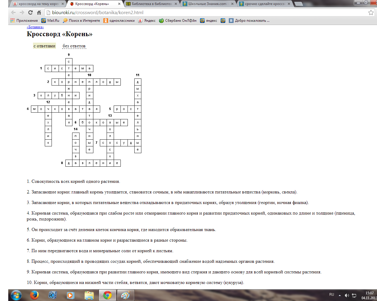 1. Совокупность всех корней одного растения.2. Запасающие корни: главный корень утолщается, становится сочным, в нём накапливаются питательные вещества (морковь, свекла).3. Запасающие корни, в которых питательные вещества откладываются в придаточных корнях, образуя утолщения (георгин, ночная фиалка).4. Корневая система, образующаяся при слабом росте или отмирании главного корня и развитии придаточных корней, одинаковых по длине и толщине (пшеница, рожь, подорожник).5. Он происходит за счёт деления клеток кончика корня, где находится образовательная ткань.6. Корни, образующиеся на главном корне и разрастающиеся в разные стороны.7. По ним передвигаются вода и минеральные соли от корней к листьям.8. Процесс, происходящий в проводящих сосудах корней, обеспечивающий снабжение водой надземных органов растения.9. Корневая система, образующаяся при развитии главного корня, имеющего вид стержня и дающего основу для всей корневой системы растения.10. Корни, образующиеся на нижней части стебля, ветвятся, дают мочковатую корневую систему (кукуруза).11. Корни, развивающиеся на подземных боковых корнях, растущие вверх поднимаясь над поверхностью почвы, и снабжают подземные корни воздухом.12. Многослойный конусовидный колпачок из живых паренхимных клеток.13. Нежные тонкие выросты наружных клеток корня, поглощающие из почвы воду с растворёнными в ней минеральными веществами.14. Верхний плодородный слой земли, являющийся самостоятельным природным телом.