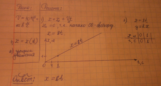 Поезд, двигаясь равномерно, прошел мимо светофора со скоростью 30 км/ч. Напишите уравнение движения поезда, приняв за начало отсчета светофор. Постройте график движения поезда.-