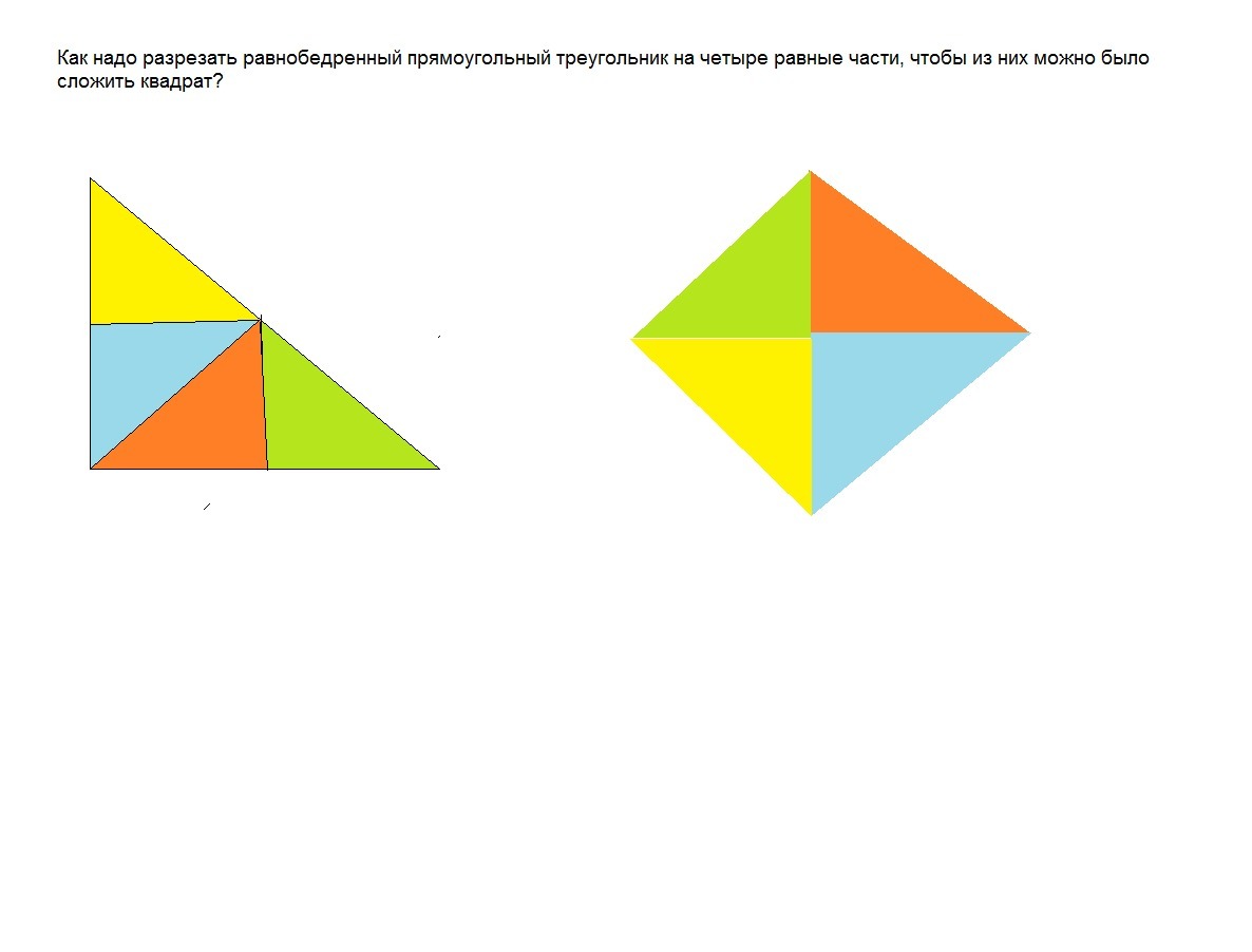 Как нужно разрезать равнобедренный прямоугольный треугольник на четыре равные части чтобы с них можно было сложить квадрат.