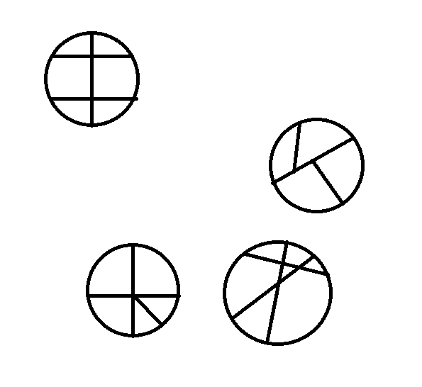 Разбейте круг тремя отрезками на 4 5 6 7 частей-