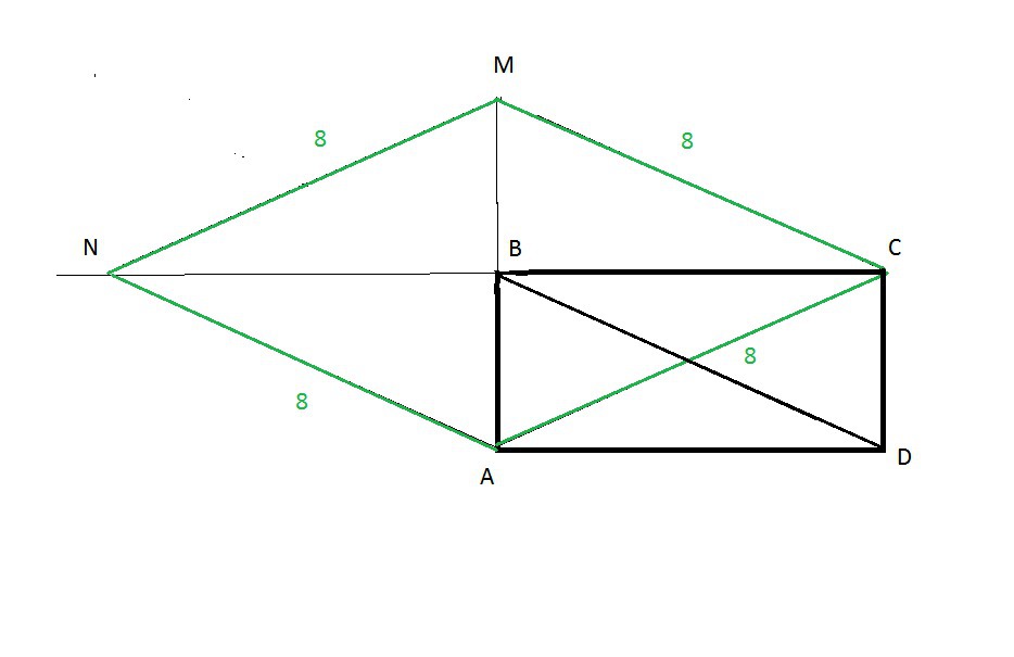 Через вершину C прямоугольника ABCD проведена прямая, параллельная диагонали BD и пересекающая пряму AB в точке M. Через точку M проведена прямая, параллельная диагонали AC и пересекающая прямую BC в точке N. Найдите периметр четырехугольника ACMN, если диагональ BD равна 8 см.