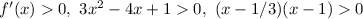 x∈(-∞;1/3)U(1;+∞), y - возрастает,