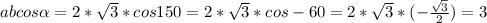 вычислите скалярное произведение ab,если модуль вектора a=2,модуль вектора b=корень из 3,а угол между векторами равен 150 градусов?