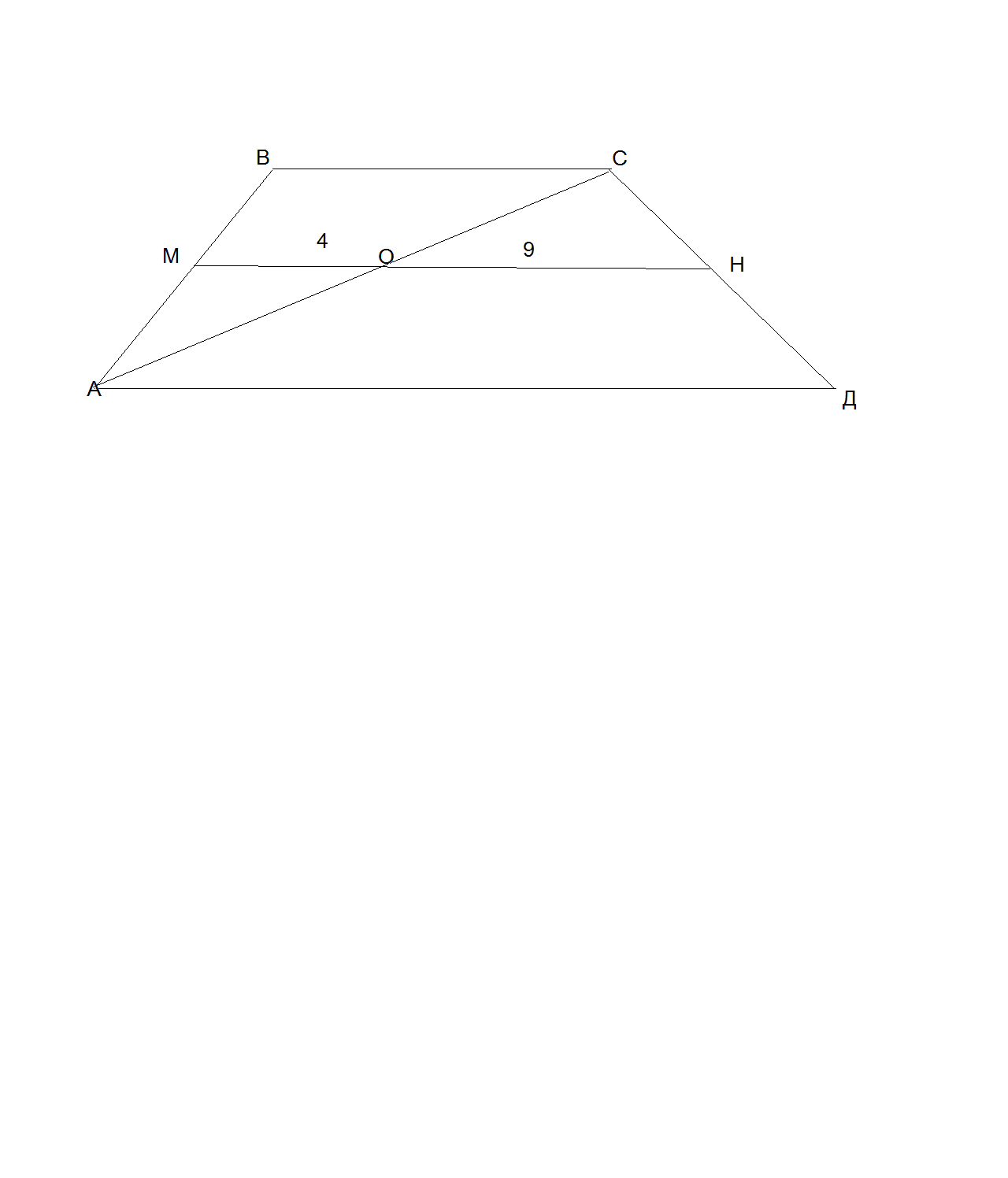 Длина средней линии трапецыи становит 4+9=13см. Отсюда мы можем найти суму основ трапецыи, за формулой про нахождения средней линии трапецыи (средняя линя равняеться полсуме основ- (ВС+АД)/2=МН), отсюда ВС+АД=13*2=26см.