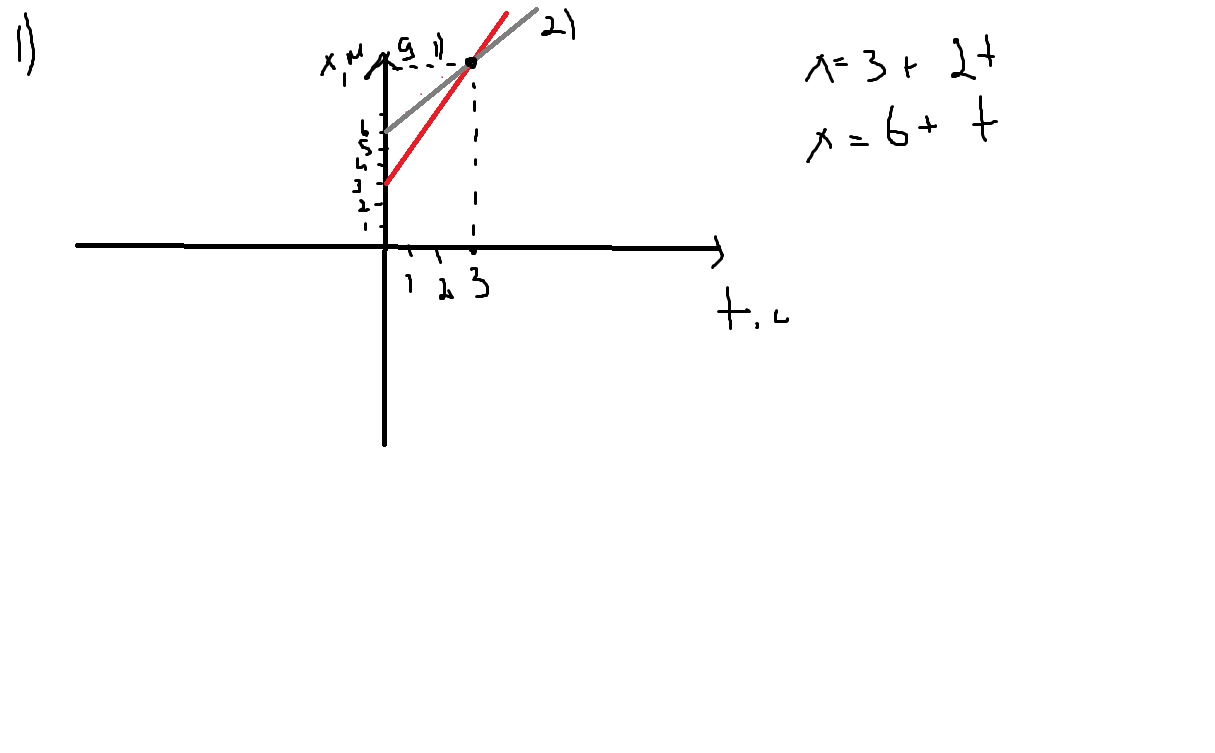 Даны уравнения движения тел х1=3+2t и X2= 6+t.Найдите место и время их встречи.Посторойте графики движения тел