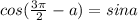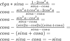 Докажите тождество: ctg a * sin a - (1 - 2cos^2 a / sin a - cos a) == cos (3пи / 2 - a) Помогите пожалуйста,никак не сходится.